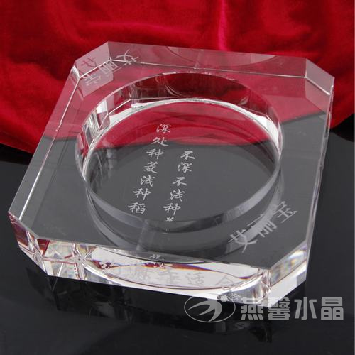 水晶烟灰缸采用K9水晶精心雕琢而成。K9水晶是一种性能优异的材料,其透光度、折光效果、硬度和质感均十分优越,甚至比天然水晶更纯净、色泽性更好.经打磨抛光、精细雕刻后得到各种形状的高档水晶座,晶莹透亮,光彩夺目,手感沉重,光线通过时可透射出绚丽的七彩虹光。水晶寓意吉祥平安、和谐纯净,能给人带来好运、财运,并带来成功,采用全新制做工艺、做工精制可按您提供的图纸进行设计与定制,可为各政府机构企事业单位定制LOGO及贺词等
